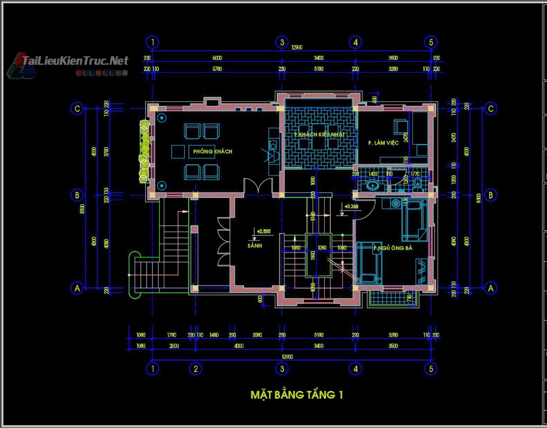 - Mặt Bằng Tầng 1: Không gian sinh hoạt chung sang trọng với phòng khách lớn, kết hợp phòng làm việc và một phòng ngủ tiện lợi cho người lớn tuổi.