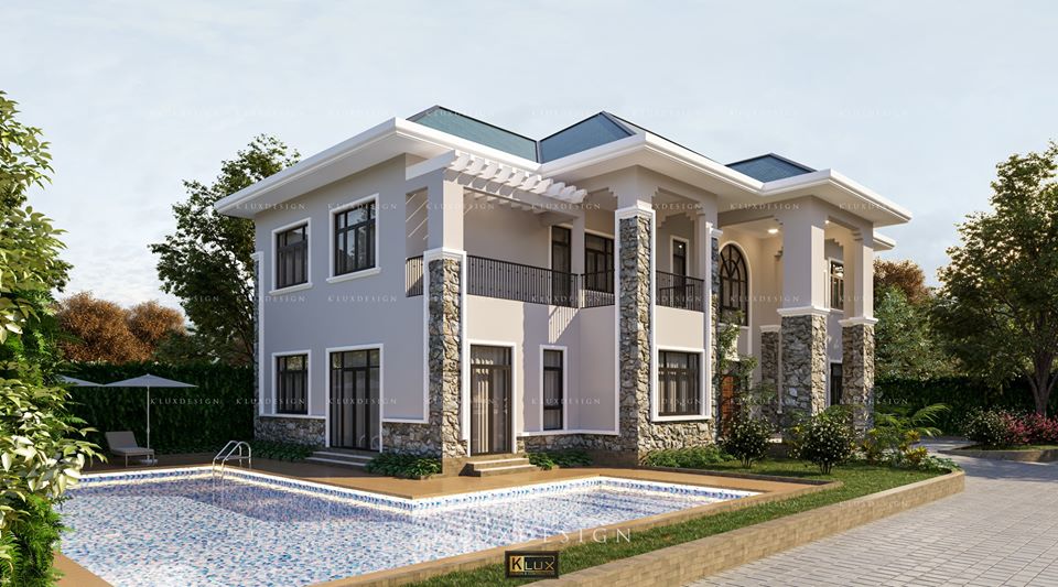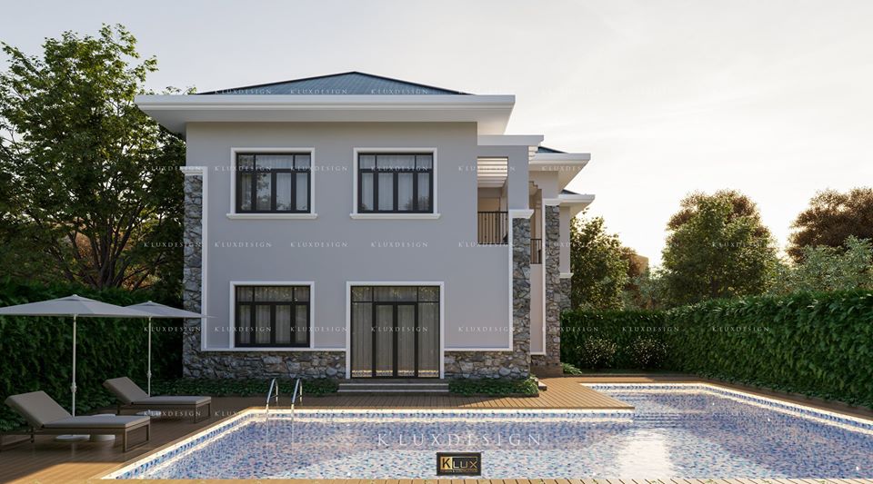 Biệt thự này mang phong cách hiện đại với hai tầng sang trọng và đầy đủ tiện nghi. Thiết kế rộng rãi của ngôi nhà được nhấn mạnh qua việc sử dụng tường kính lớn, cho phép ánh sáng tự nhiên dễ dàng tràn vào không gian bên trong. Bên ngoài, ngôi nhà được bao phủ bởi các bức tường chắc chắn với chi tiết ốp đá, tạo nên sự bề thế và bền vững.