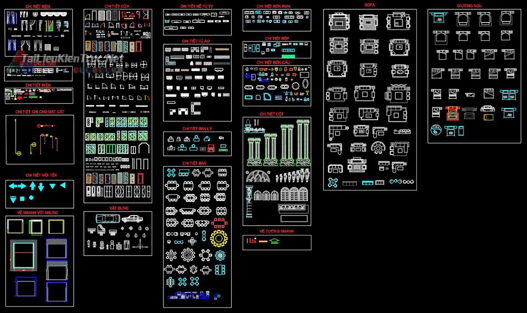 Thư viện CAD động đa năng, gồm hàng trăm block chi tiết kiến trúc và nội thất, giúp bạn thiết kế nhanh chóng và chuyên nghiệp. Bộ sưu tập bao gồm chi tiết cửa, rèm, tủ bếp, tủ áo, bàn ghế, sofa, bồn rửa, bồn cầu, thiết bị điện, trần thạch cao, cột trang trí v.v...