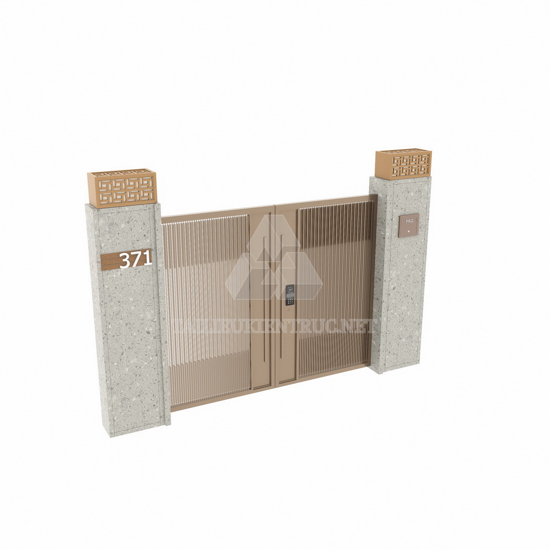Hình ảnh mô tả một mẫu cổng thiết kế tinh tế với màu sắc trung tính, tạo cảm giác hài hòa với không gian xung quanh. Cổng được làm từ vật liệu kim loại chắc chắn, có các thanh dọc song song tạo nét đẹp hiện đại và thanh lịch. Trụ cổng bên trái được gắn biển số 371, trong khi bên phải có một bảng thư nhỏ, thể hiện sự tiện dụng và tích hợp. Mặt trên của trụ cổng được trang trí với họa tiết lưới thoáng, thêm phần sinh động cho tổng thể.
