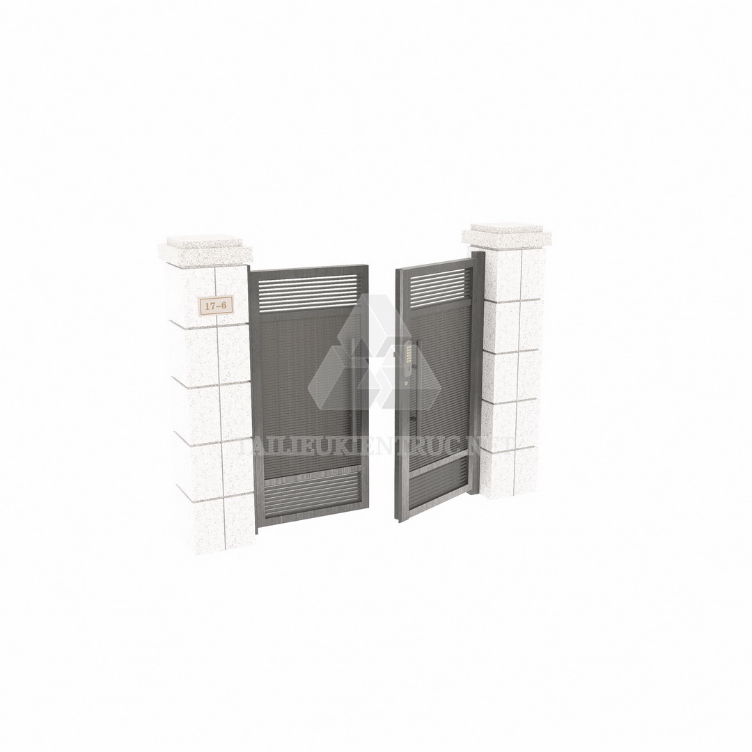 Các hình ảnh cho thấy một thiết kế cổng gọn gàng và tinh tế, được bố trí giữa hai cột trụ lớn vững chãi. Cổng được làm từ vật liệu kim loại bền bỉ với màu sắc trung tính, tạo cảm giác hiện đại và phù hợp với nhiều phong cách kiến trúc khác nhau.