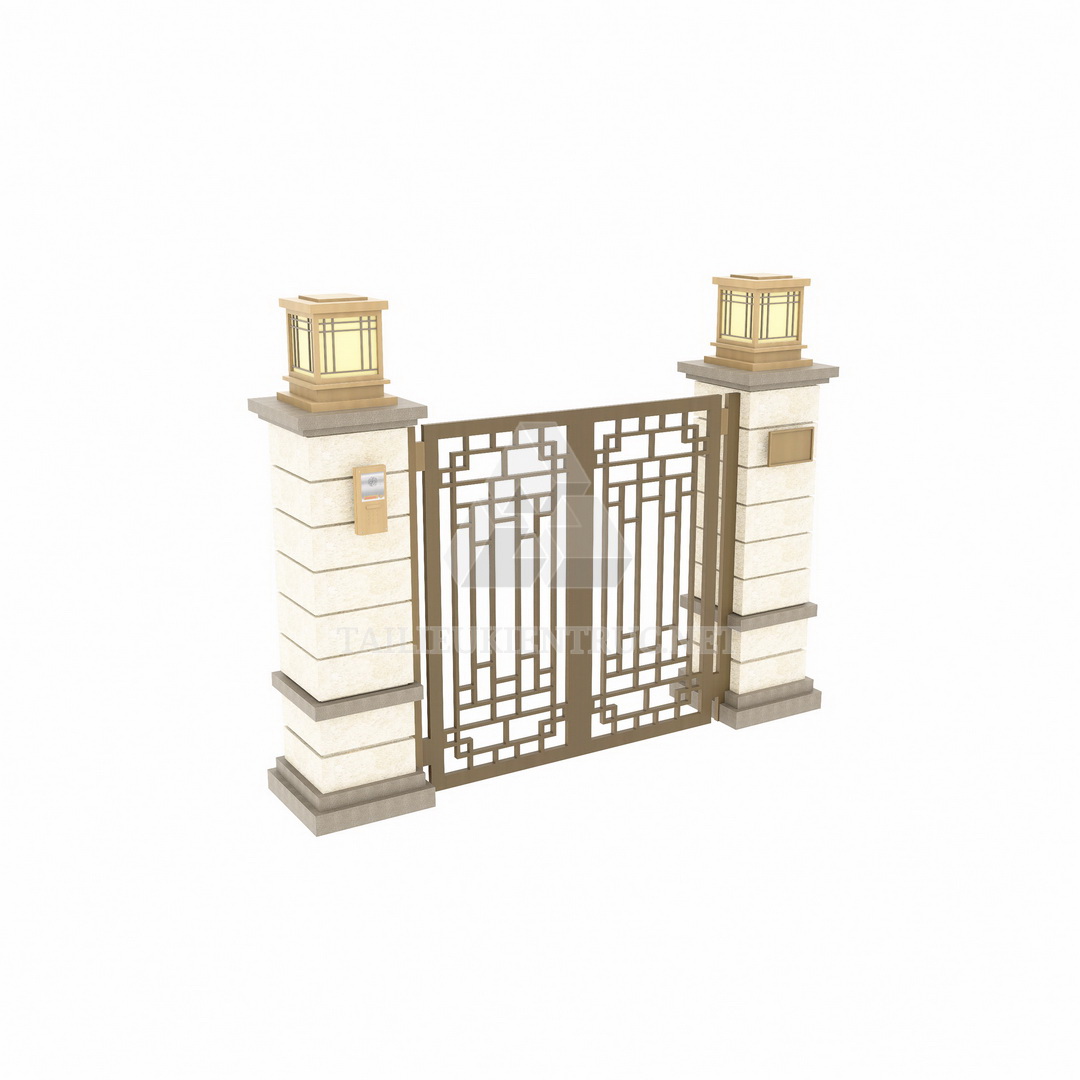 Về kỹ thuật, mẫu cổng này có kích thước cân đối với khối nhà, sử dụng vật liệu sắt chịu lực cao nhằm đảm bảo an toàn và độ bền lâu dài. Điểm nhấn của thiết kế nằm ở các hộp đèn chiếu sáng được đặt trên mỗi trụ cổng, tạo điểm nhấn sang trọng, tăng cường ánh sáng vào ban đêm và an toàn cho người sử dụng.