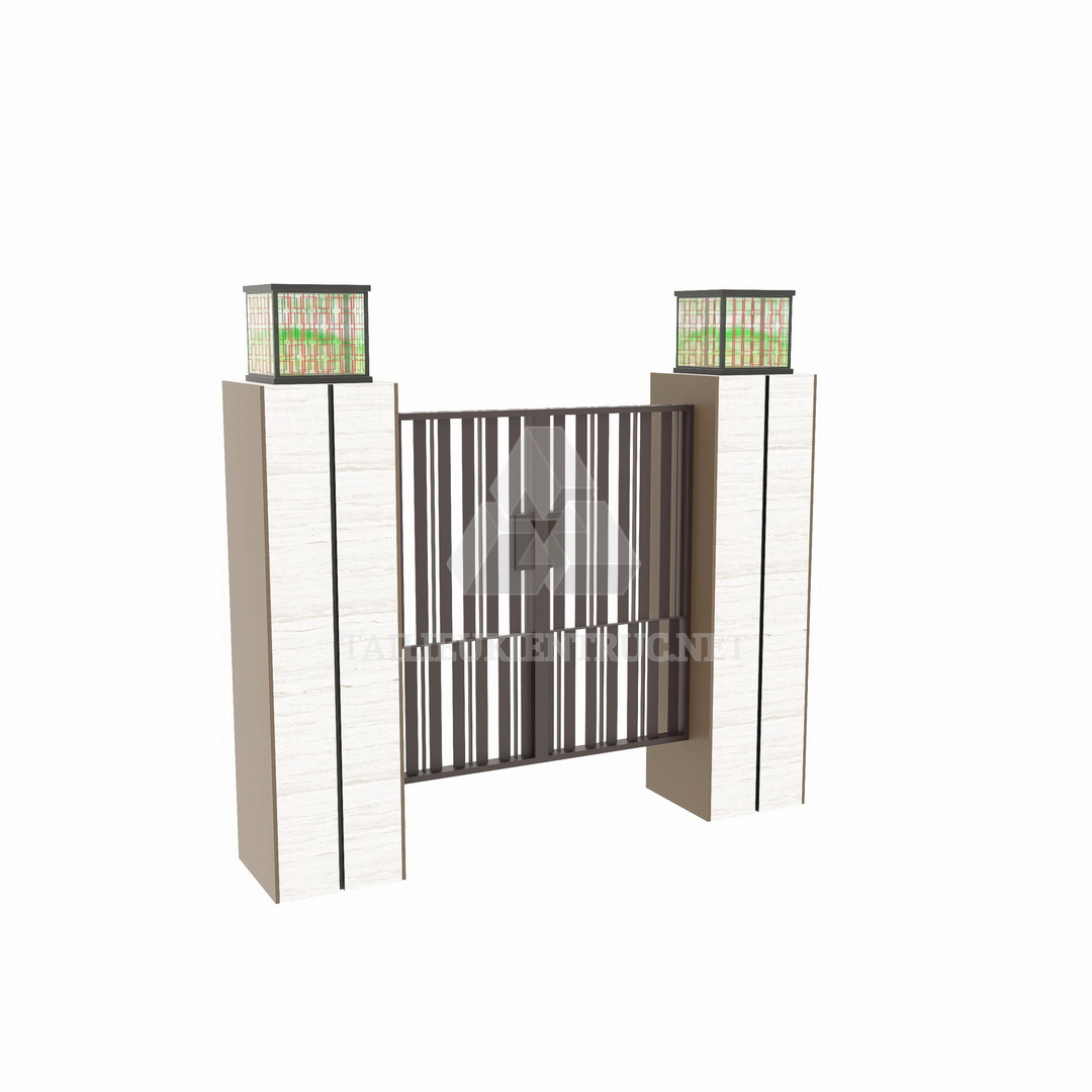 Hình ảnh cung cấp một cái nhìn sinh động về cấu trúc cổng gồm hai trụ chính với màu sắc trang nhã. Mặt cổng được thiết kế với các thanh kim loại nằm dọc xen kẽ tạo cảm giác chắc chắn mà vẫn thanh thoát. Các trụ được làm từ vật liệu giống như đá với đường kẻ đen nổi bật, tạo điểm nhấn giữa tông màu trắng sáng. Phía trên trụ cổng là những đèn trang trí màu sắc ấm áp, cung cấp ánh sáng nhẹ nhàng và gợi sự hấp dẫn cho cổng khi đêm xuống.