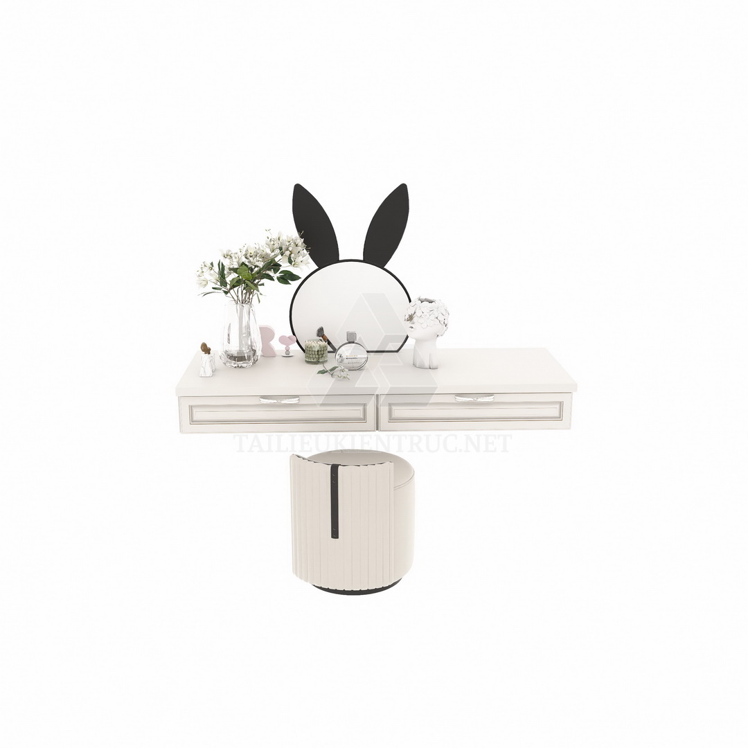 Bộ bàn trang điểm này nổi bật với thiết kế hiện đại, tối giản nhưng không kém phần sang trọng. Mặt bàn được làm từ chất liệu gỗ nhẵn mịn, với tông màu trắng kem tạo nên vẻ thanh lịch và dễ dàng hòa hợp với nhiều kiểu nội thất khác nhau. Đặc biệt, điểm nhấn của bộ bàn chính là chiếc gương hình tròn với họa tiết tai thỏ đen, mang lại cảm giác độc đáo và trẻ trung.