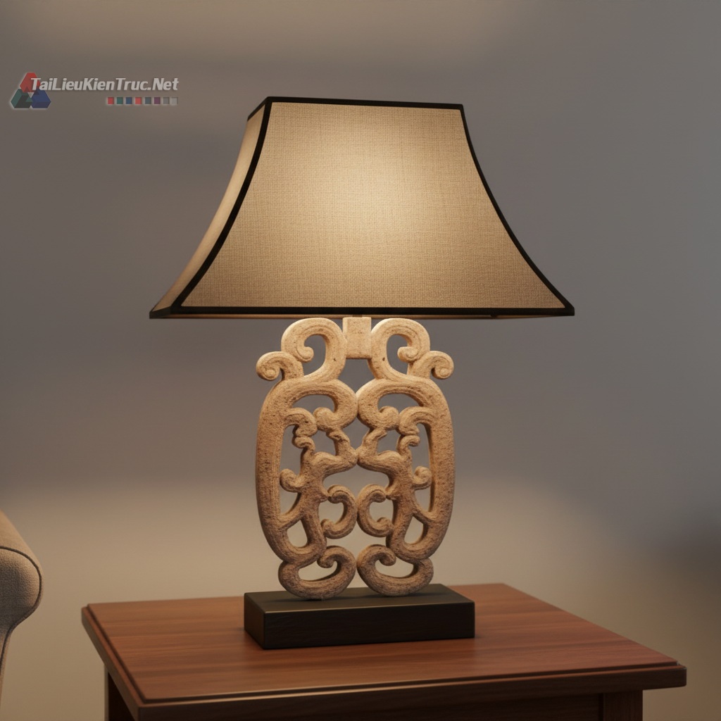Mẫu đèn bàn được thiết kế với độ chính xác và chất liệu cao cấp, mang lại vẻ ngoài thanh lịch và hiện đại. Đèn có phần chân được chạm khắc tinh xảo từ vật liệu giống như đá tự nhiên, tạo cảm giác chắc chắn và bền bỉ. Chụp đèn có dạng hình thang, với màu sắc nhẹ nhàng, làm tăng thêm tính thẩm mỹ và giúp ánh sáng lan tỏa đều hơn.