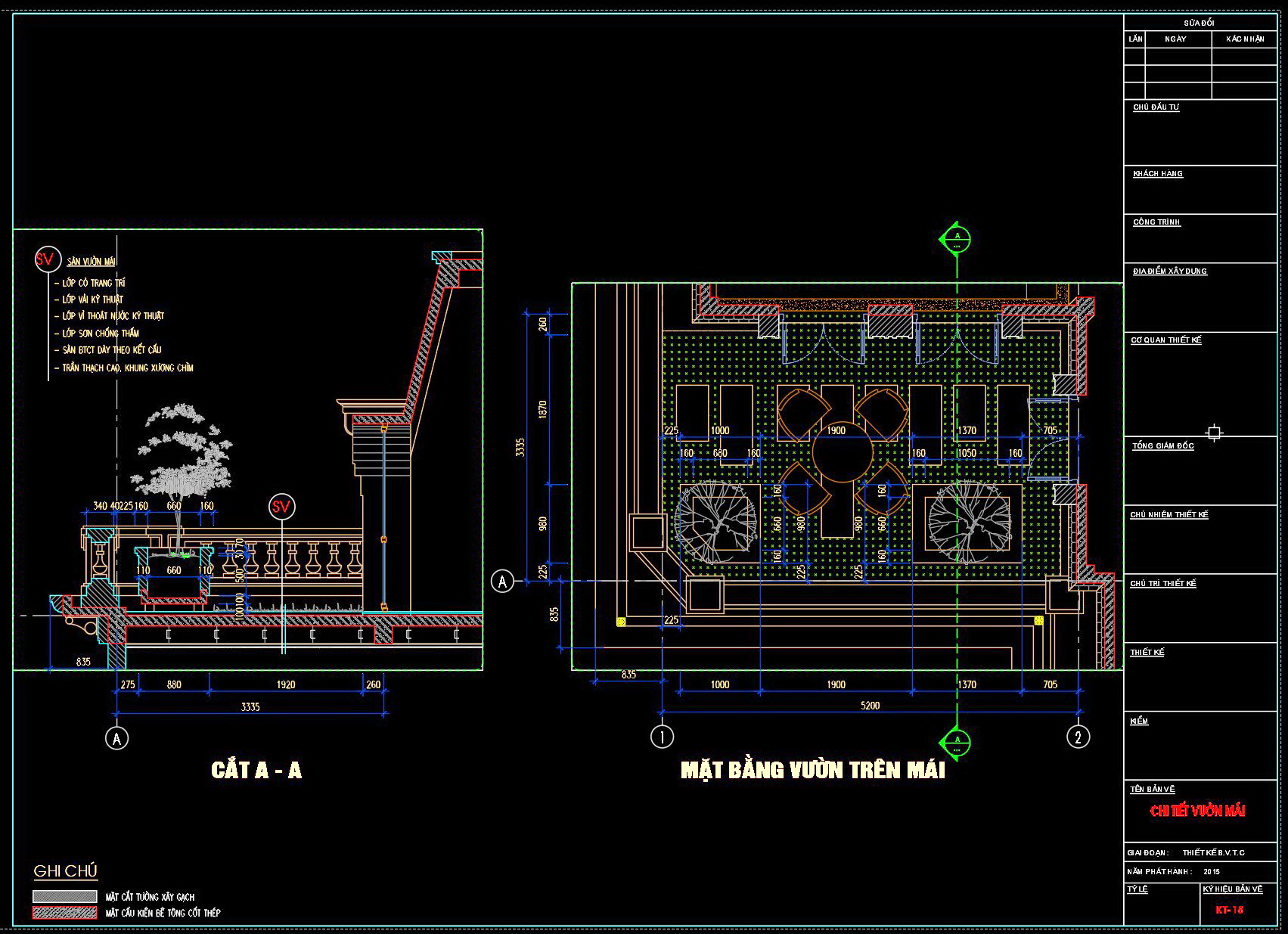 Hình ảnh cung cấp cái nhìn chi tiết về cấu trúc và bố trí của một vườn trên mái. Bản vẽ bao gồm hai phần chính: mặt cắt và mặt bằng vườn. Mặt cắt thể hiện rõ các lớp vật liệu khác nhau cần thiết cho việc thi công, trong khi mặt bằng mô tả cách sắp xếp cây cối, đồ đạc và lối đi.