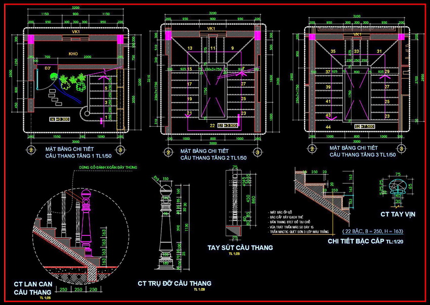 Bản vẽ bao gồm các sơ đồ chi tiết của mặt bằng cầu thang tại ba tầng khác nhau, mô tả cách bố trí lan can, trụ đỡ cầu thang, và thiết kế tay vịn.