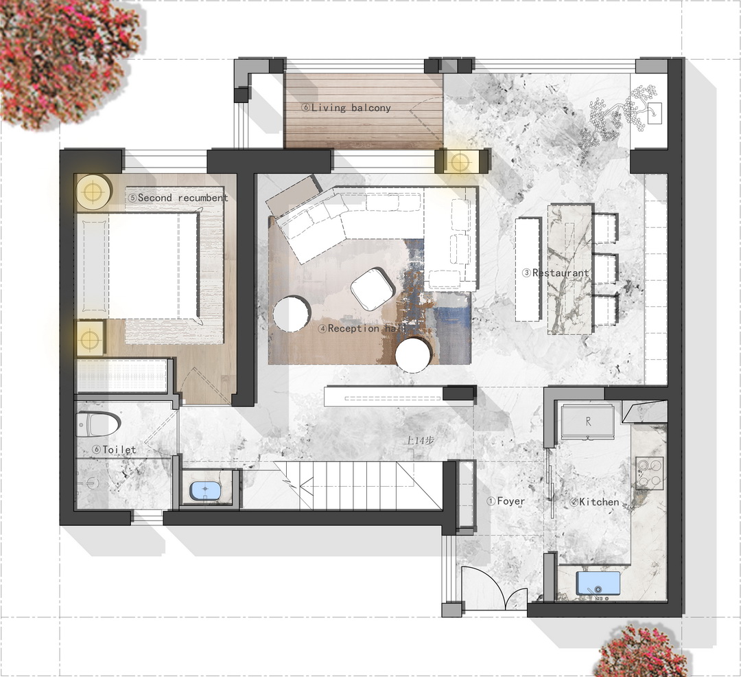 - Tầng 1 bao gồm các khu vực quan trọng như ban công, phòng tiếp khách, và nhà bếp. Không gian được bố trí hợp lý để tối ưu hóa sự thoải mái và ánh sáng tự nhiên. Phòng khách rộng rãi, kết hợp với khu vực ăn uống, tạo nên một không gian mở thân thiện và ấm cúng.