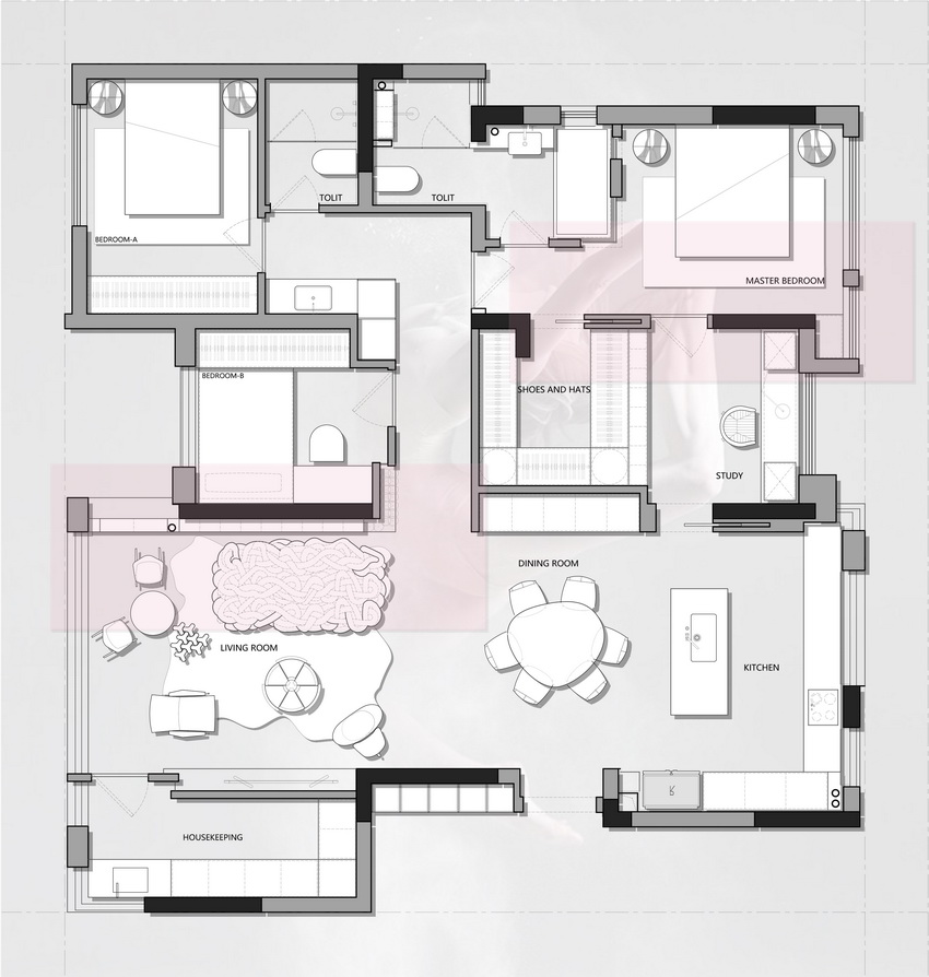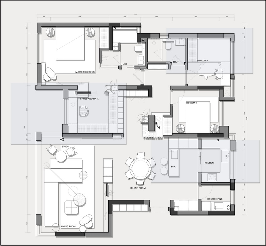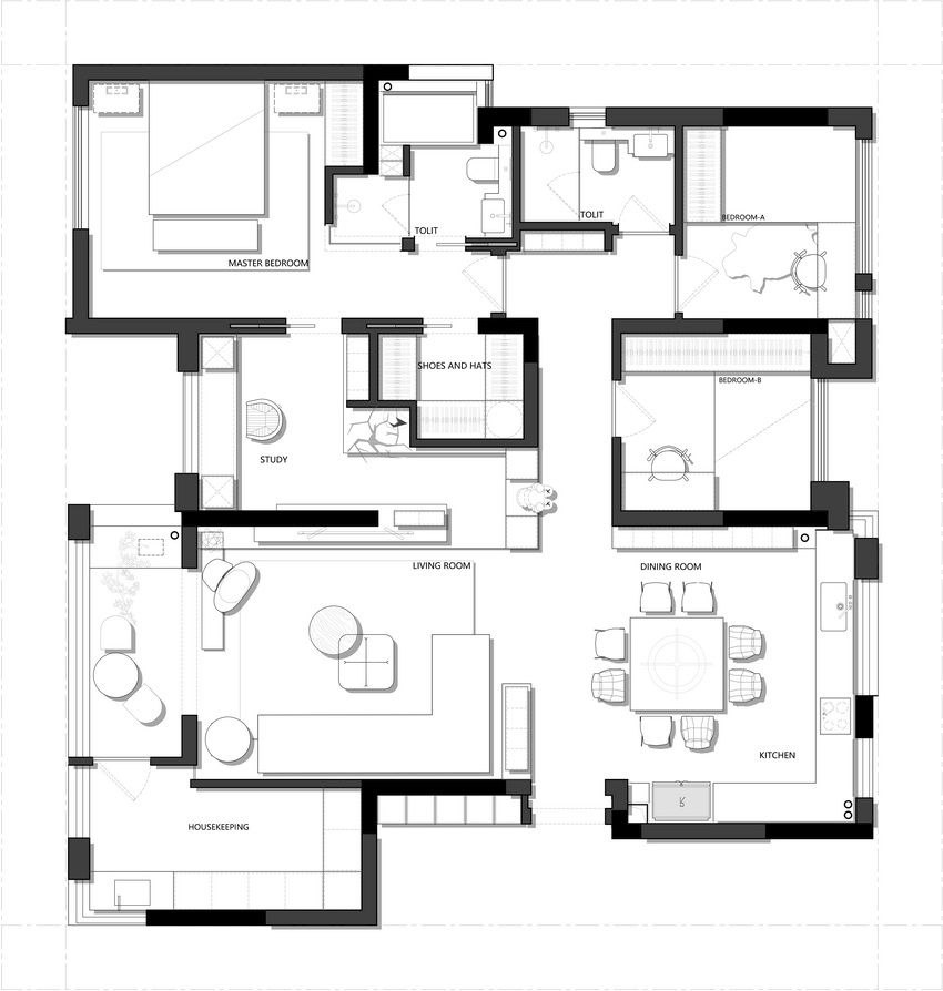 Hình ảnh thứ hai là một bản vẽ đen trắng của cùng một không gian, nhấn mạnh vào việc sắp xếp các khu chức năng. Cách bố trí hợp lý này tối ưu hóa ánh sáng và không gian, đảm bảo sự thoải mái cho cư dân.
