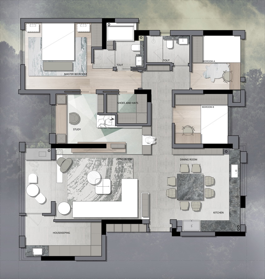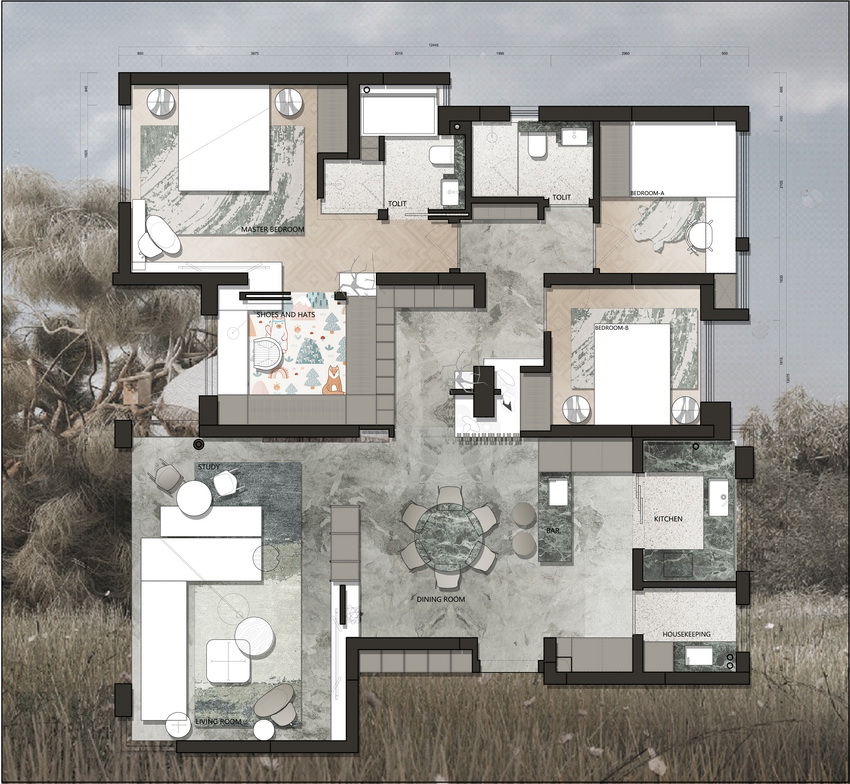 Hình ảnh đầu tiên minh họa một bản thiết kế màu sắc thể hiện không gian sống với các khu vực như phòng khách, phòng ăn, và phòng ngủ được bố trí hợp lý. Các khu vực chính thiết kế theo kiểu mở, tạo sự kết nối liền mạch giữa các không gian. Màu sắc ấm áp từ sàn đá và nội thất gỗ tương phản với các chi tiết hoa văn độc đáo, mang lại cảm giác ấm cúng và hiện đại.