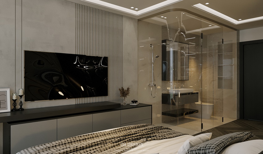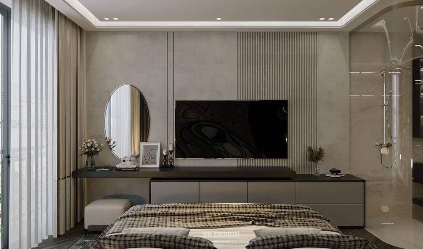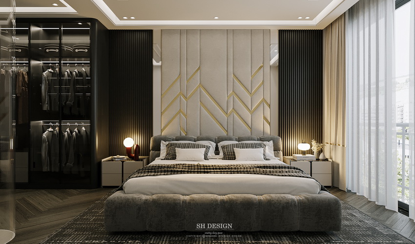 Thiết kế phòng ngủ này nổi bật với sự kết hợp hoàn hảo giữa phong cách hiện đại và sự tinh tế trong từng chi tiết. Điểm nhấn của phòng là bức tường đầu giường với những đường vân họa tiết sắc nét tạo chiều sâu và cảm giác ấm áp, sang trọng.