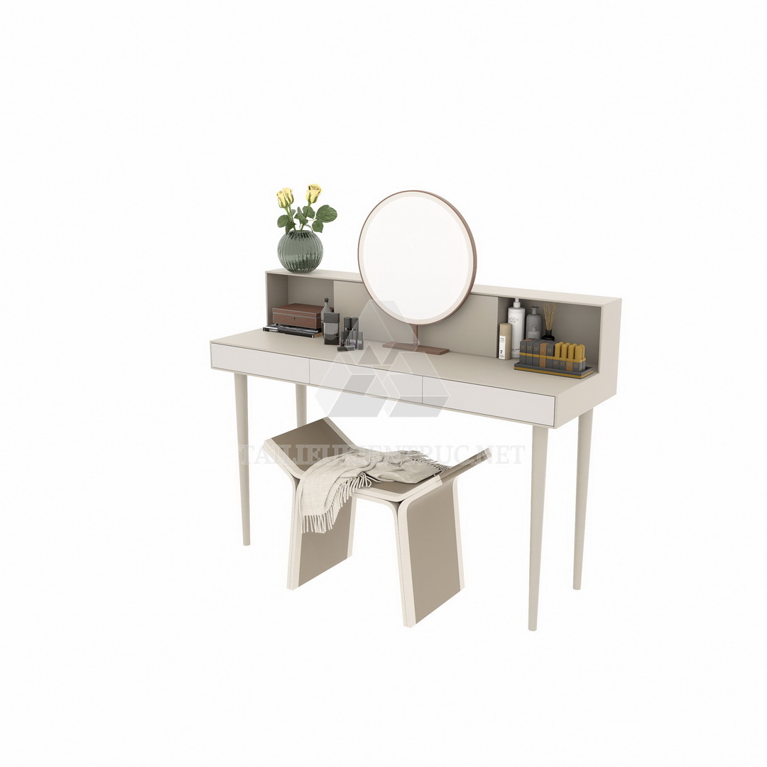Bàn trang điểm này thích hợp cho nhiều ứng dụng thực tế, từ không gian phòng ngủ gia đình đến các studio làm đẹp chuyên nghiệp. Thiết kế hiện đại không chỉ mang lại sự tiện ích trong việc lưu trữ và sắp xếp các đồ dùng cá nhân mà còn tạo ra không gian thư giãn và chăm sóc bản thân tốt nhất.