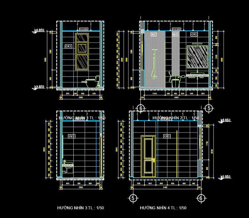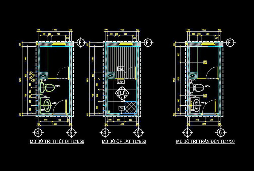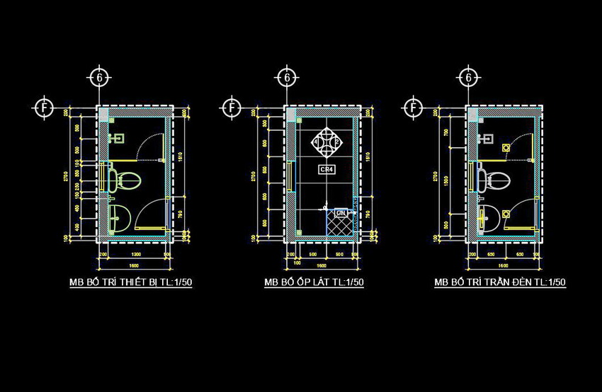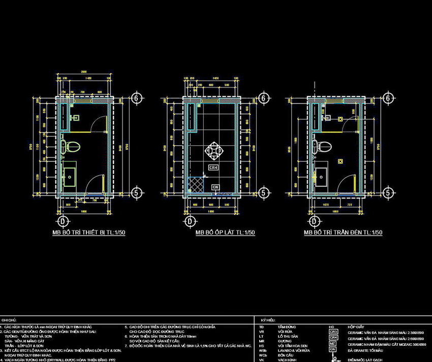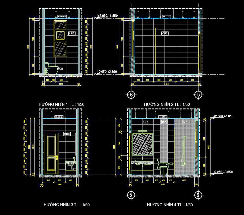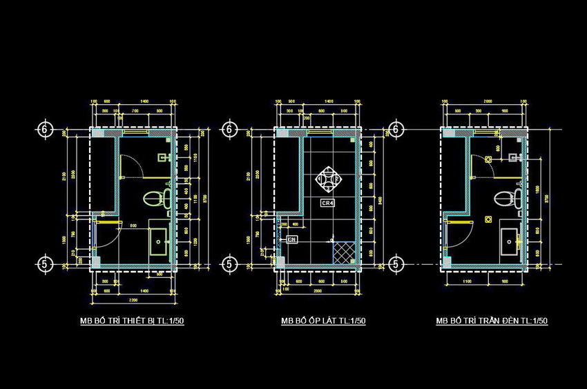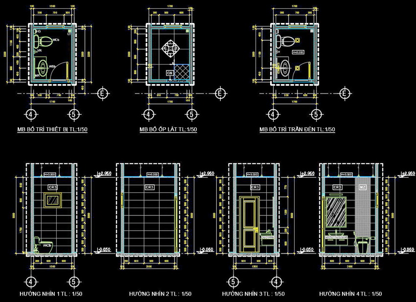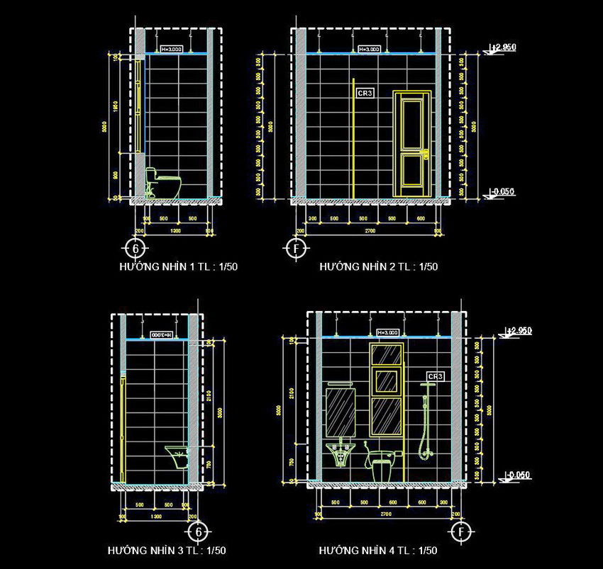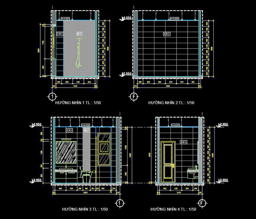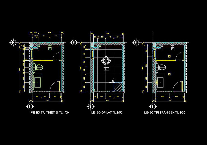 Bản vẽ này thể hiện việc sắp xếp và bố trí các thiết bị trong nhà vệ sinh với tỷ lệ 1/50. Mặt cắt và mặt bằng được thể hiện rõ ràng, chi tiết từng phần của không gian. Các chi tiết từ cửa ra vào, bồn cầu, bồn rửa, đến cách bố trí gạch và trần đều được hiển thị một cách tỉ mỉ.