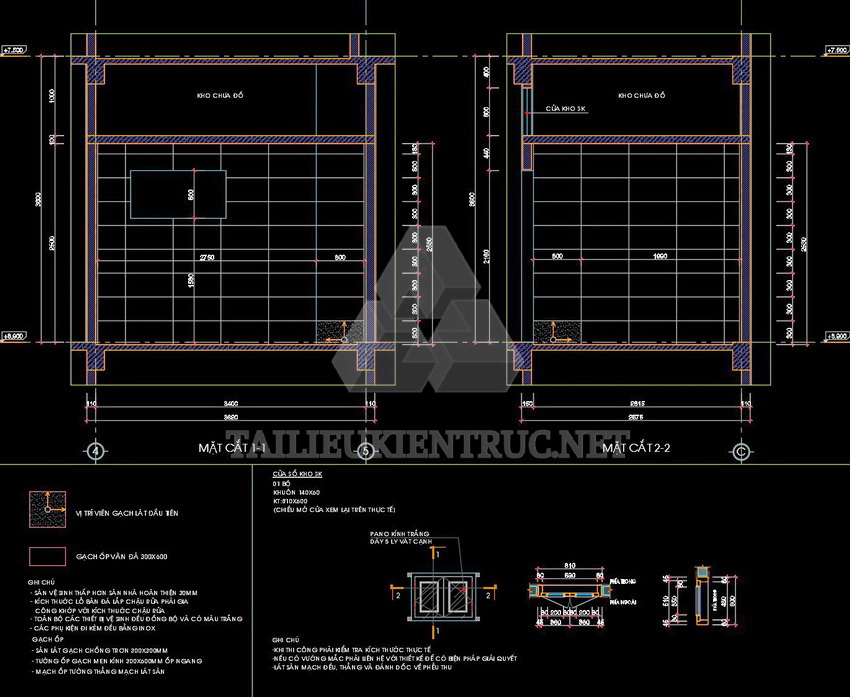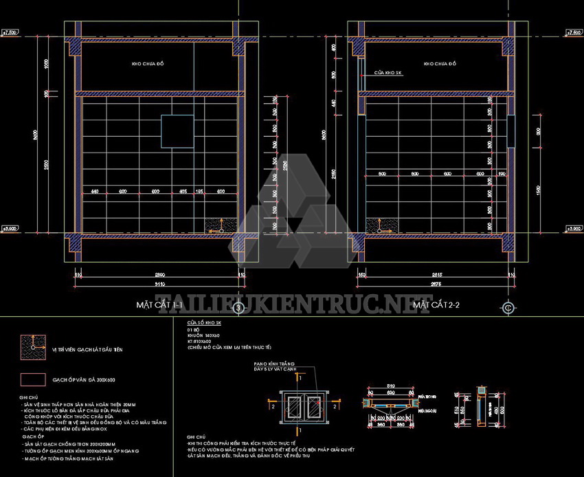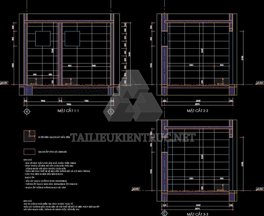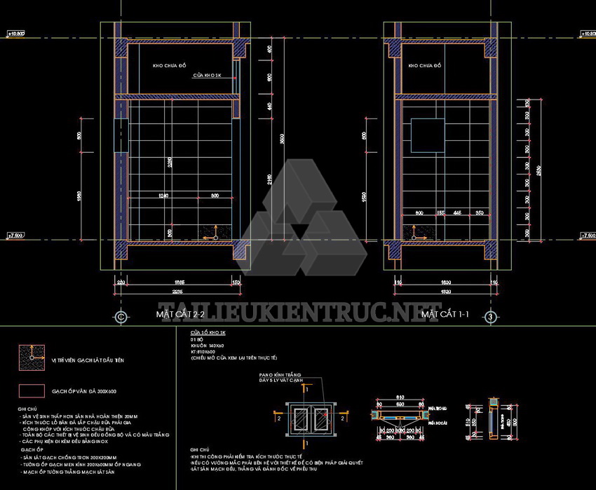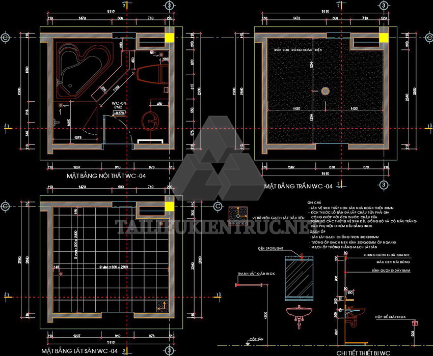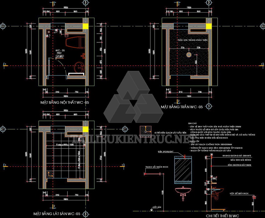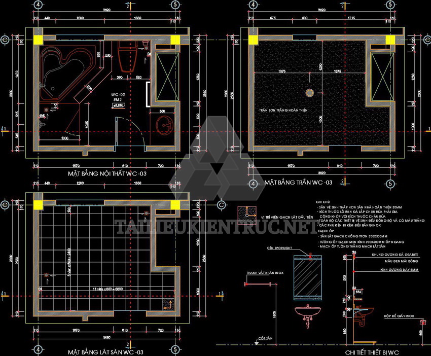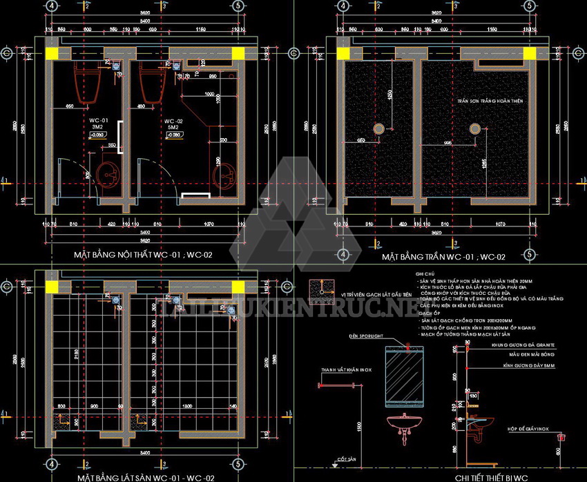 Phần mặt bằng nội thất hiển thị rõ ràng vị trí lắp đặt các thiết bị như bồn cầu, lavabo, cùng với kích thước cụ thể. Mặt bằng trần cung cấp thông tin về cách bố trí trần với các vật liệu hoàn thiện. Ngoài ra, bản vẽ còn đi kèm với ghi chú hướng dẫn lắp đặt và chọn vật liệu như gạch lát sàn, trần thạch cao, giúp tối ưu hóa quá trình thiết kế và thi công.