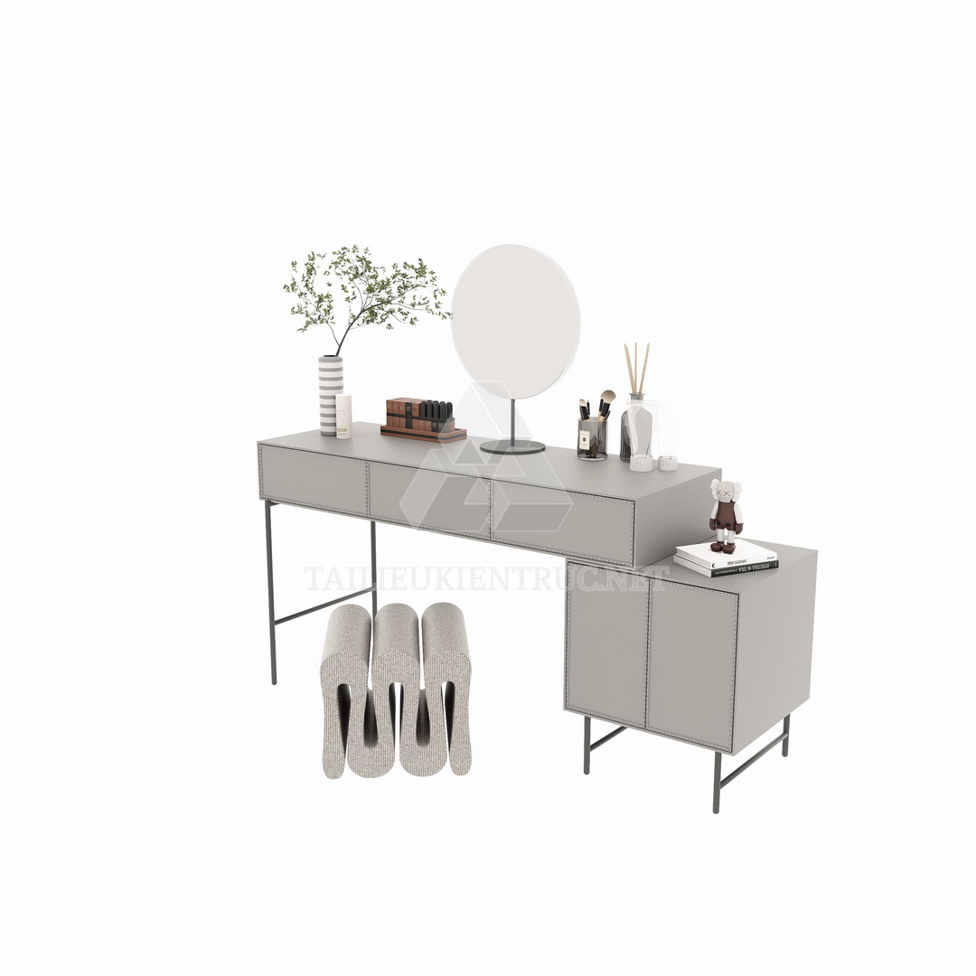 Hình ảnh mô tả một bộ bàn trang điểm hiện đại với thiết kế tối giản và tinh tế. Bộ bàn gồm một bàn chính với bề mặt phẳng, được trang trí với các vật dụng như gương tròn, bình hoa và đèn trang trí, tạo nên một không gian thanh lịch và tiện dụng cho người dùng.