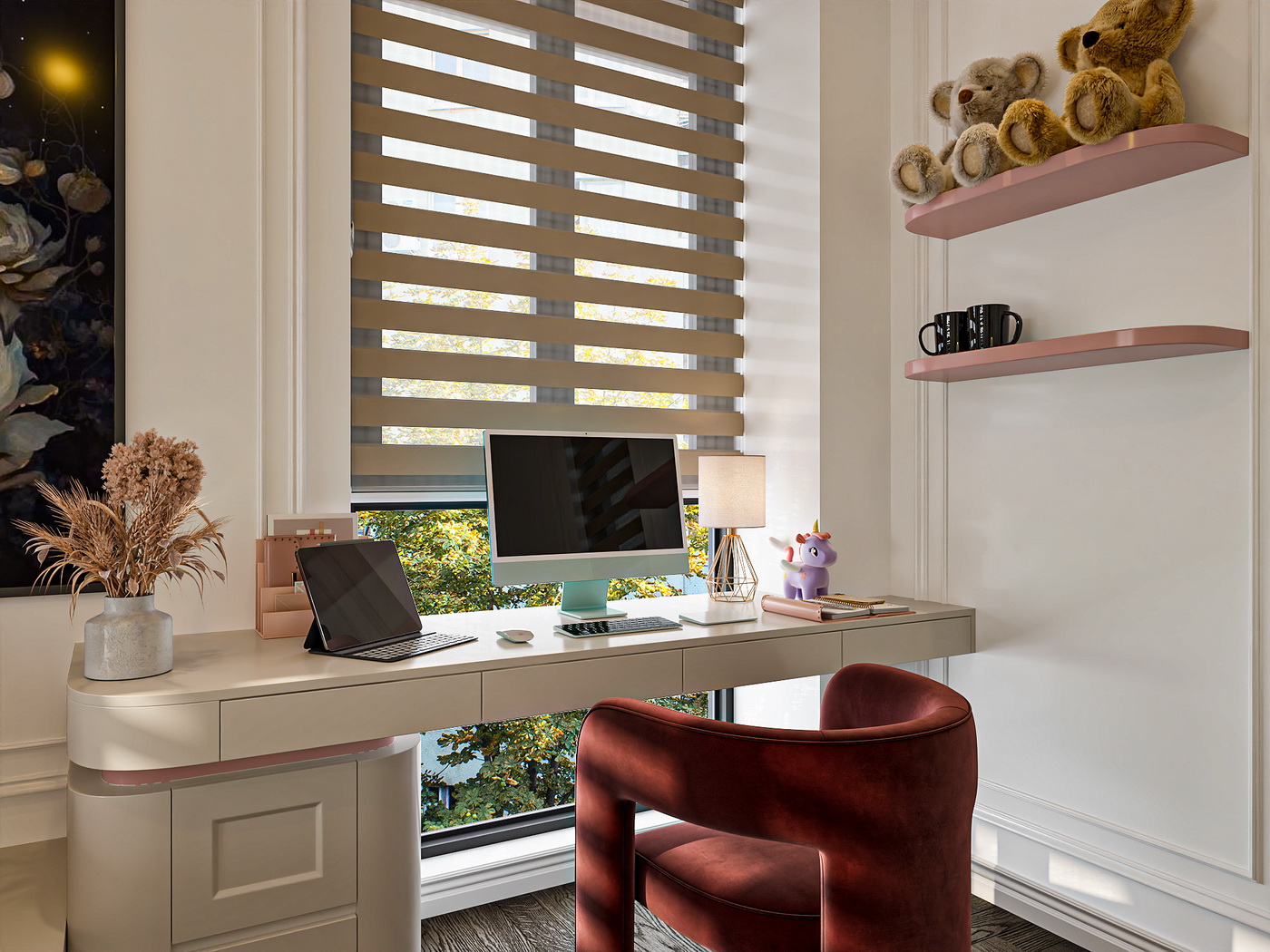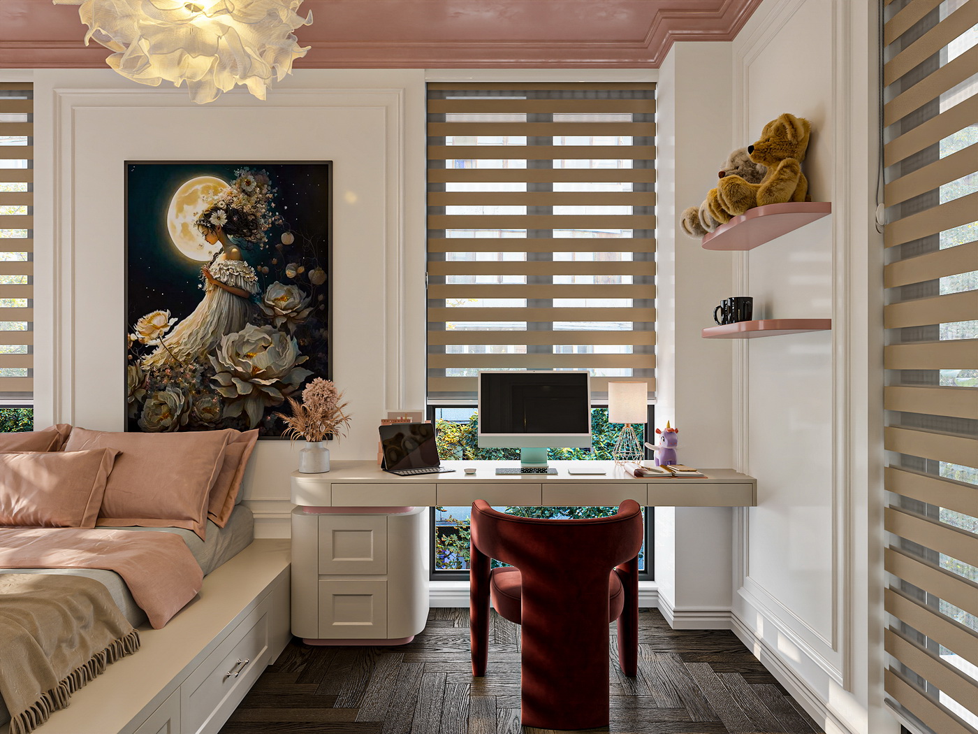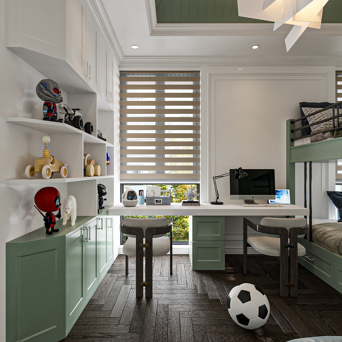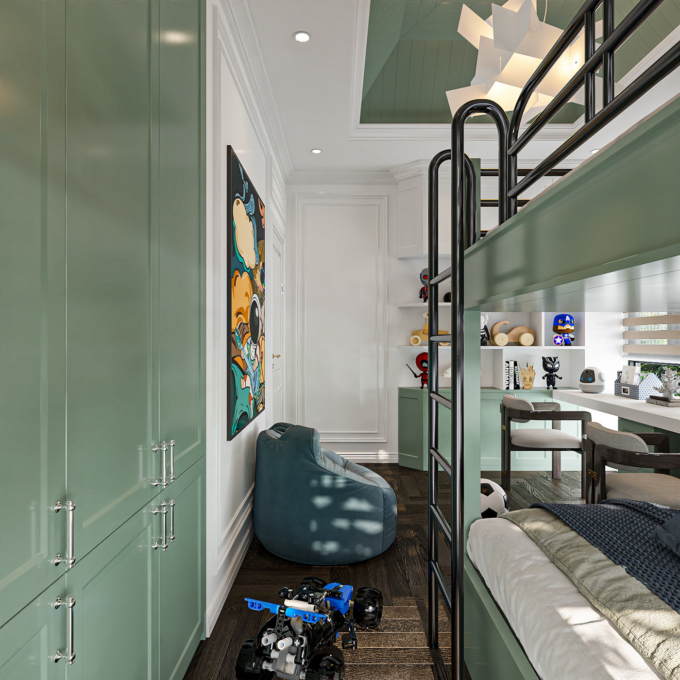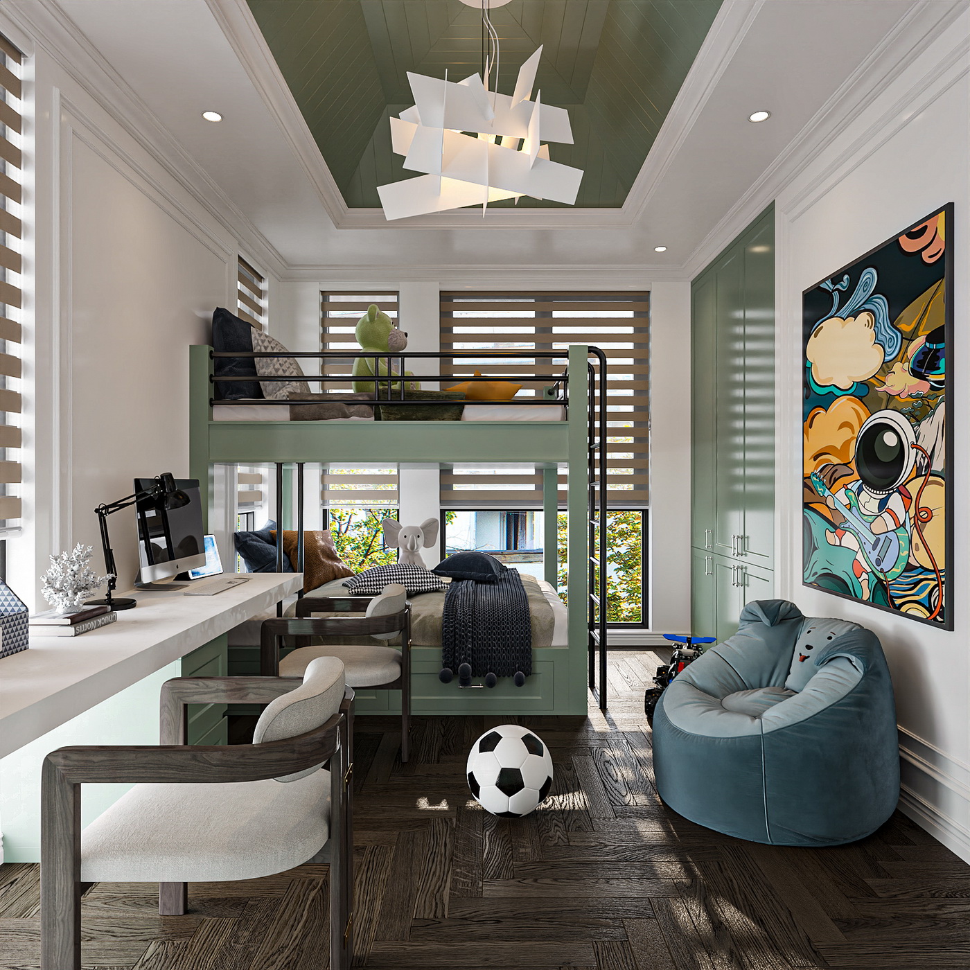 Hình ảnh nổi bật với thiết kế nội thất phòng ngủ trẻ em tươi mới và sáng tạo. Phòng ngủ được bài trí với nhiều chi tiết đáng yêu, phù hợp cho trẻ em. Các món đồ nội thất được chọn lựa kỹ lưỡng, từ giường tầng kết hợp bàn học đến những chiếc ghế và kệ đồ chơi màu sắc hài hòa. Căn phòng sử dụng gam màu trung tính, nhấn nhá bằng các phụ kiện sáng màu, tạo ra không gian vừa vừa hiện đại vừa vui tươi.