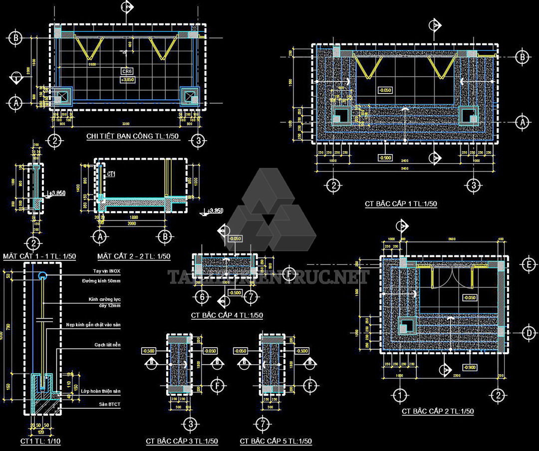 Bản vẽ hiện đang dạng chi tiết của một ban công tam cấp, bao gồm nhiều góc độ và cấu trúc khác nhau, được thể hiện qua nhiều phần cắt và kích thước cụ thể. Dưới đây là mô tả chi tiết: