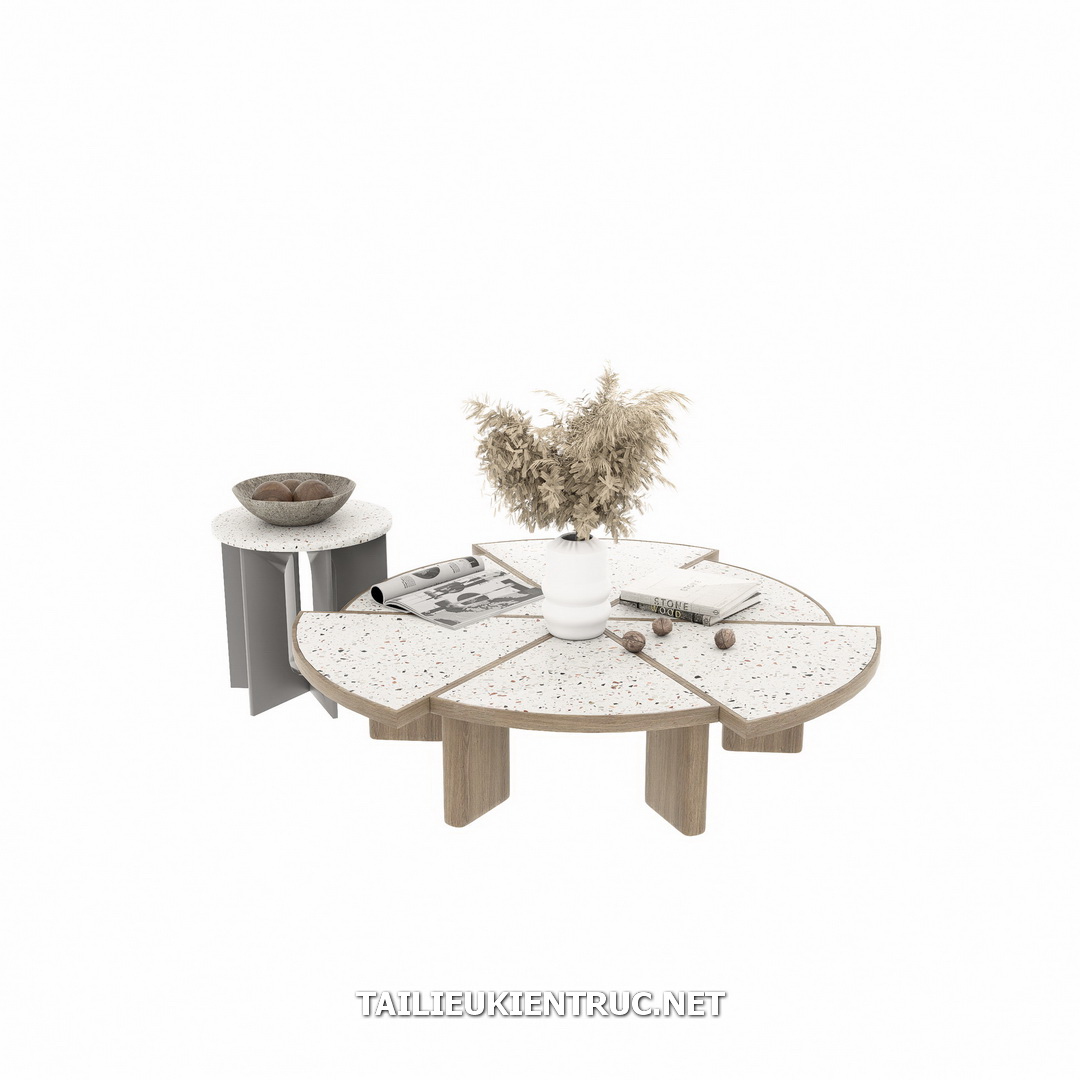 Bộ bàn trà này bao gồm hai bàn với kiểu dáng và cấu trúc khác nhau. Chiếc bàn lớn có thiết kế đa giác độc đáo với bề mặt được chia thành các mảnh hình tam giác, tạo nên một tổng thể hài hòa. Mặt bàn sử dụng chất liệu đá mài màu sáng, điểm xuyết hoa văn tự nhiên, tạo cảm giác cao cấp và hiện đại. Chân bàn bằng gỗ, thiết kế chắc chắn, tạo sự ổn định và bền bỉ.