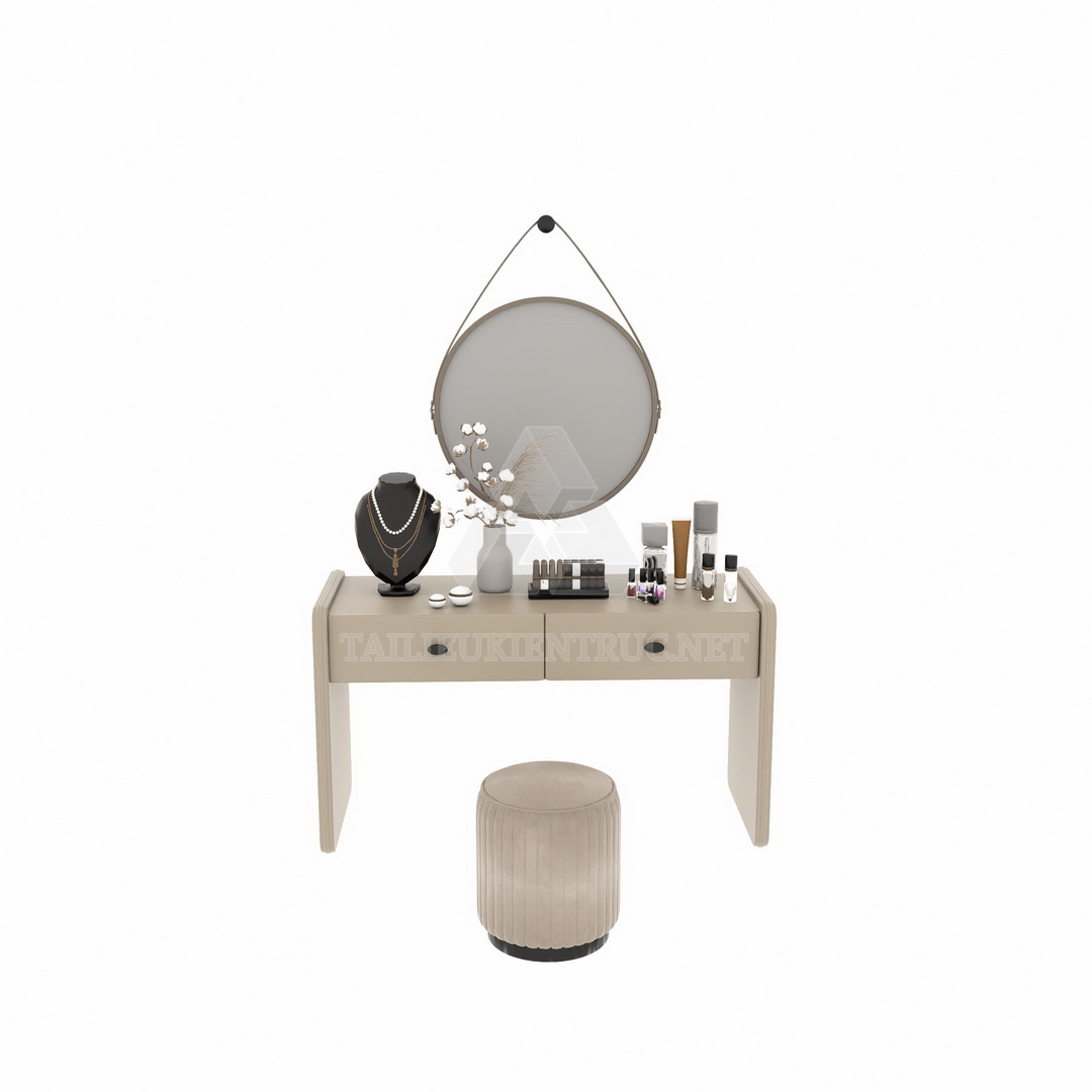 Bộ bàn trang điểm này bao gồm một bàn có ngăn kéo, gương treo tròn lớn và một ghế ngồi bọc nệm, tất cả đều được thiết kế với gam màu trung tính, mang lại vẻ thanh lịch và dễ phối hợp với nhiều phong cách nội thất khác nhau. Trên mặt bàn, các vật dụng trang điểm và phụ kiện như chai mỹ phẩm, hộp trang sức và lọ nước hoa được sắp xếp gọn gàng, tạo nên một không gian tiện dụng và thẩm mỹ.