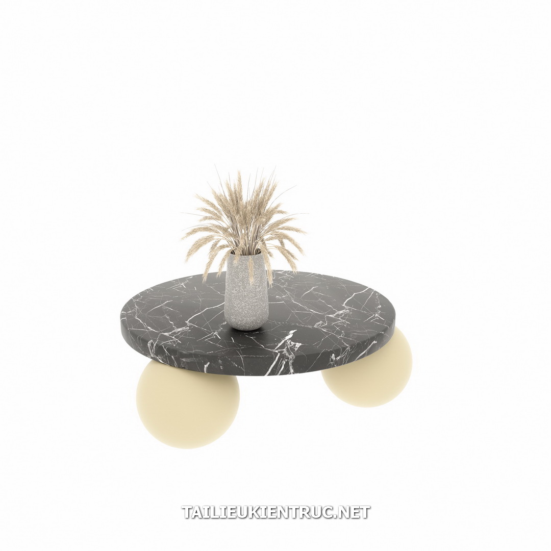 Mẫu bàn này nổi bật với thiết kế mặt tròn, sử dụng chất liệu đá hoa cương với hoa văn tinh tế, thể hiện sự sang trọng và cứng cáp. Chân bàn được thiết kế độc đáo dưới dạng hình cầu màu vàng nhạt, tạo điểm nhấn thú vị và nâng cao tính thẩm mỹ cho sản phẩm.